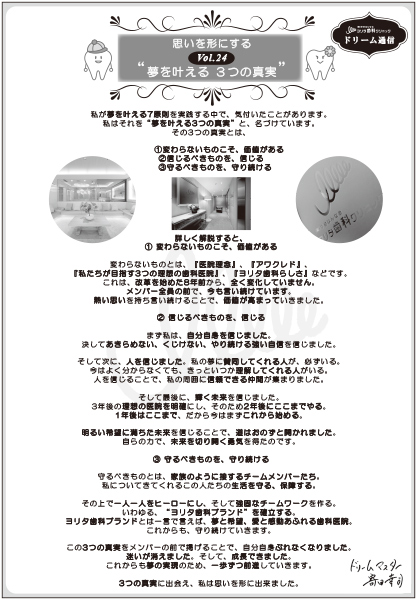 ■Vol.24 夢を叶える 3つの真実 ・私は、8年も同じ思いを持ち続けることや、周りの人に言い続けたことがありません。 ・3つの真実とはっきり確実に言い切っている院長の思いに、覚悟も感じられました。 ・「医院理念」「アワクレド」「私達が目指す3つの理想の歯科医院」「ヨリタ歯科 ・どのような場でも、考え方が違う人や、自分を理解してくれなさそうな人がいると |