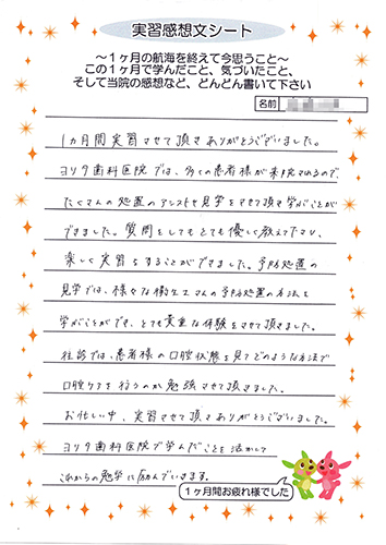 ヨリタ歯科クリニックで、学んだことを活かして、これからの勉学に励んでいきます。