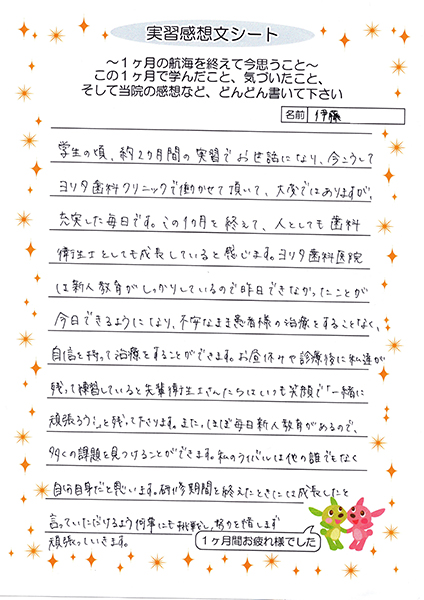 この一ヶ月間を終えて、人としても歯科衛生士としても成長していると感じます。