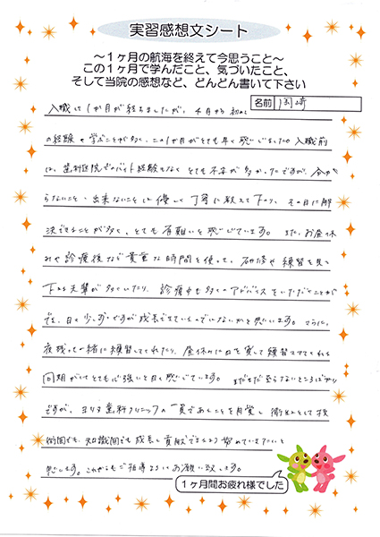 入職1ヶ月が経ったので、実習感想文シートが届きました。