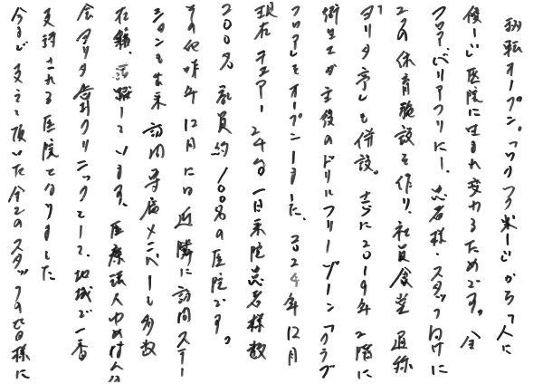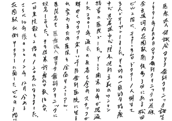 医療法人社団 健誠会 ヨリタ歯科クリニック誕生 1991年6月8日、ヨリタ歯科クリニックは、近鉄奈良線河内花園駅南徒歩3分にある そして、開業10年が経過した2001年、過去の反省も含め、スタッフが輝くワクワク楽しい その結果、 診療台数10台、一日来院数も2倍の120名になりました。 さらに2019年、2階に衛生士が主役のドリルフリーゾーン「ヨリタクラブフロア」を 2024年12月現在、チェアー24台。一日来院患者様数200名、社員約100名の医院です。 その他、昨年12月には、近隣に訪問ステーションも出来、訪問専属メンバーも多数在籍 医療法人ゆめはんな会ヨリタ歯科クリニックとして、地域で一番支持される医院と 今まで支えて頂いた、全てのスタッフの皆様に、心から感謝です。 2025年のテーマは、「個人が輝く組織作り」です。 この先、「ここで働いて良かった、こんな医院ならずっと働き続けたい」 ということで、さらなる医院の成長と、明るい未来の実現のため、愛知・岐阜を中心に 私は今まで通り、院長として、経営と診療に携わっていきます。 ともに笑顔あふれる、夢いっぱいの医院づくりに、これからも邁進していきましょう!! |