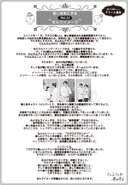 ■Vol.22 セルフイメージ 2002年11月、ワクワク楽しい、夢と希望あふれる歯科医院を作りたい。 私たちのメインターゲットである、12歳以下の子供たち、 そのため、カムカムフェスタなどのイベント開催(私たちは健康学習と呼んでいます)や、 それは全て、始めは私が演出していました。 そして私が書いたシナリオを演じるのは、チームメンバーたち。 そんな演出を、したいと思っています。 演じるキャスト(メンバー)に、患者様から有難うの言葉がけをして頂けるよう、 私のセルフイメージは、もちろん“歯科医師”ではありません。 私のセルフイメージは、“ワクワクプランナー”。 メンバーにも、 自分のセルフイメージを、明確にすること。 大切であると、実感しています。 セルフイメージを確立すれば、思いは形になります。 |