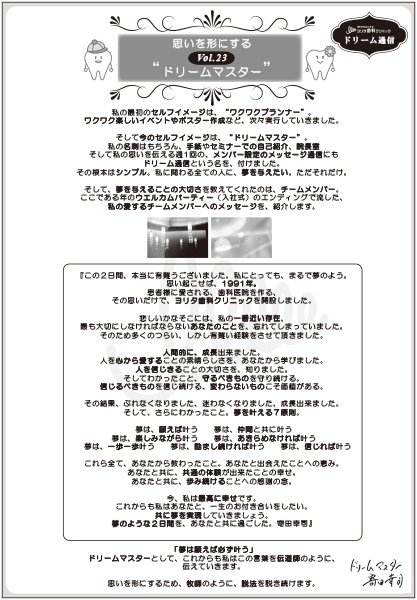 ■Vol.23 ドリームマスター ・夢は願えば叶うというワードに、共感出来ました。 ・人間的に成長するという言葉が、大切だと感じました。 ・働く為には沢山の人達に支えられる事で上手く回ると思っています。 ・院長自身が常に理想を掲げ、常に夢に想い描いているからこそ、ヨリタ歯科は常に成長し続け ・夢を叶える7原則が素敵だと思いました。 |