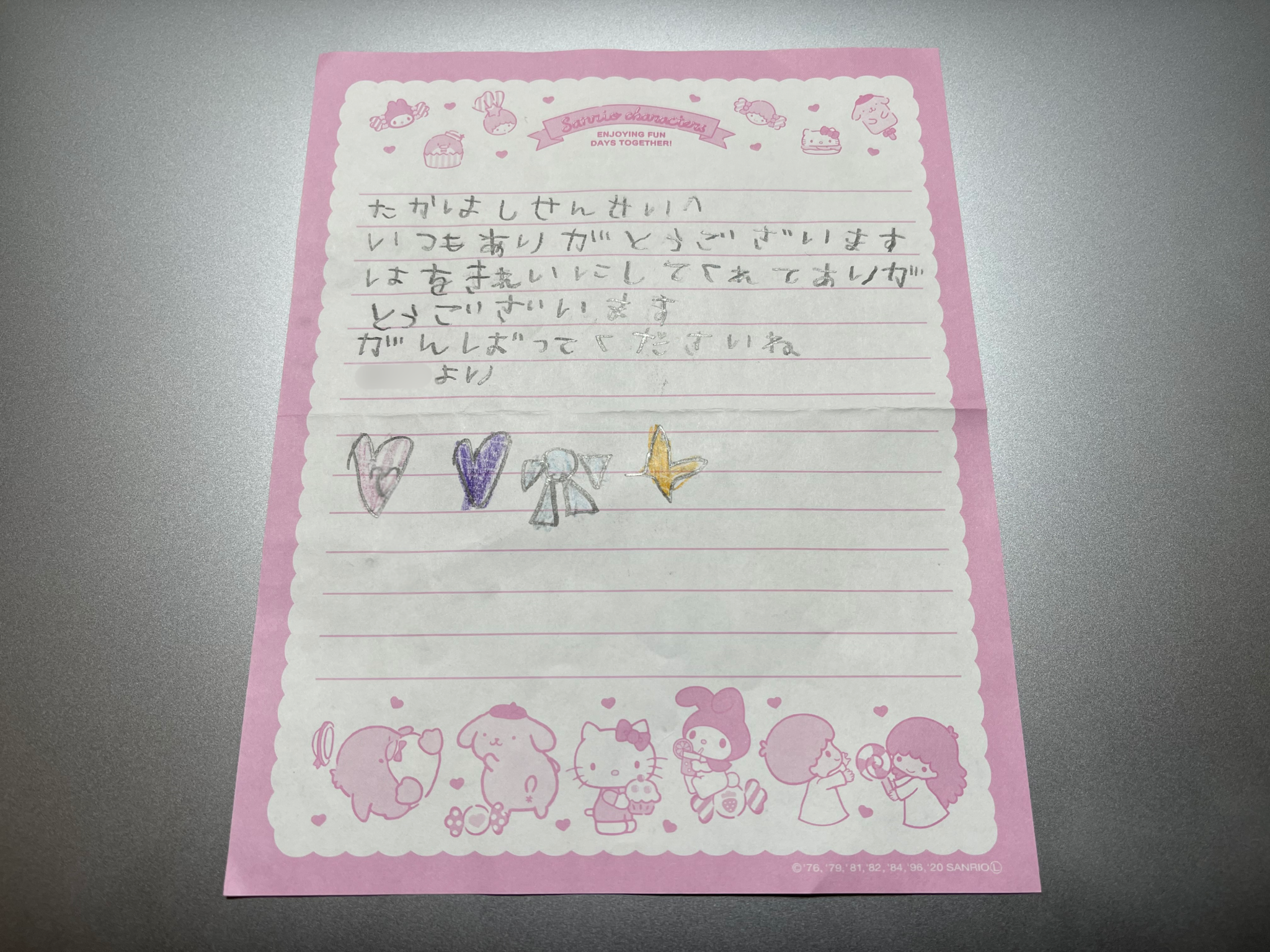 いつも治療を頑張ってくれている、幼稚園生の女の子からのお手紙です。
