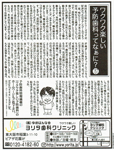 前回までの咬むシリーズですが、好評だったのでアンコールでもう一度。 咬むシリーズ本当の最終回は、咬む力と歯ぎしりについて 専門用語で歯ぎしりをグライディング、噛み締めをクレンチング、カチカチを この中で特に怖いのは、歯ぎしりと、噛み締めです。 この2つは、とても歯に強い力がかかります。 まずは、意図的に歯ぎしりをしてみてください。 かなり力が加わる事が、わかると思います。 実は、体重の数倍の力がかかると言われていて、その力が歯に加わると、 僕たちはよく目印として、前から数えて3番目の歯、つまり犬歯を見ます。 ところが歯ぎしりをずっとしていると、次第に先が削れていき、真っ平らになります。 その削れ具合がとても大きいと、歯ぎしりをしている可能性が高いです。 次に、食いしばりは一見するとわかりにくいですが、歯医者に指摘された事が 上顎の部分や下の歯の内側に、硬く丸い骨のようなものがある方は要注意です。 また顔を見たときにエラがはっている方も、力が強い傾向があります。 筋肉が大きいので、当然咬む力は強くなります。 食いしばりも歯ぎしり同様に、かなり歯にダメージが生じます。 治療した部位では取れたり、割れたりします。 しっかり噛むことは、全身にとてもいい影響を与えます。 しかし、問題となっている歯ぎしりや食いしばりの力は食事とは比べものになりません。 しかし、夜間のことは僕たち歯科医師でもコントロールできません。 そうです、残念ながら歯ぎしりを完全に止めることは難しいのが、実際のところです。 なので今は治療の代わりに、夜間につけるマウスピースをお勧めしています。 自分が歯ぎしりをしているかどうか、気になった方は一度歯科医院を |