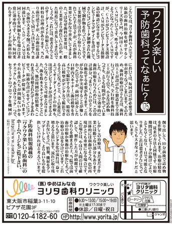 ワクワク楽しい予防歯科ってなあに vol.176 こんにちは、ヨリタ歯科の入江です。 昨今よく聞くようになったCAD/CAMですが、CADがコンピュータ 要するにコンピュータでデザインを設計して、さらにコンピュータ制御された 工業製品では昔から取り入れられていた手法ですが、これが歯科業界にも ではなぜ歯科の業界は、一般の工業界より遅れていたのか、また最近になって 当たり前の話ですが、人の歯の形は誰一人として同じ人はいません。 また、虫歯の大きさや削った形も毎回違います。 CAD/CAMでは同じものを何個も作る場合は非常に効率的です。 そのため、歯科治療のほとんどは、歯科技工士が設計から製造まで全部行って CAD/CAMで効率的に歯科治療を行うためには、この設計部分、つまりCADの 歯を数本スキャンすることによって、他の周囲の歯の情報と、これまでに蓄積された それを僕たちが問題ないかをチェックし、あとはクリック一つで、セラミックの 治療の精度は、従来の方法と同様です。 治療期間はコンピュータの助けにより、とても早くなり、1日で可能となりました。 これは患者さんにとっても、とても大きなメリットだと思います。 しかしこの治療法、まだまだ手作業には勝てない部分もあります。 具体的には前歯のような、色の再現がとても重要になる場合です。 この場合は、やはり人間の目で確認して、製作した方が綺麗です。 これからもデジタル化の流れは、益々増えると思います。 |