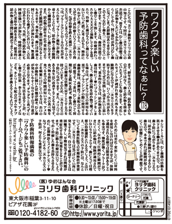 ワクワク楽しい予防歯科ってなあに vol.179 こんにちは。 今回は「二次カリエス」のお話です。 皆さんは、むし歯の治療で歯に詰め物をしたにもかかわらず、 このようなむし歯を、「二次カリエス」と呼びます。 カリエスとは、歯科用語でむし歯のことを指します。 治療が終わったから大丈夫だと油断してケアを怠ったり、治療した歯は なぜ治療を終えた歯が、二次カリエスになってしまうのでしょうか? ひとつは、プラークコントロールの不足が考えられます。 プラーク(歯垢)が歯に付着することにより、詰め物と歯の隙間から細菌が また、詰め物の経年劣化や変形によりできた隙間が、むし歯の原因に 食事の際、歯には体重と同じくらいの力が加わります。 無意識に行われる歯ぎしりにおいては、この比ではありません。 経年劣化でいえば、詰め物そのものだけではなく、歯と詰め物を 劣化したセメントが剥がれ落ちた所もまた、隙間になるのです。 二次カリエスを予防するためには、いくつか方法がありますので 基本的なことでは、詰め物がある歯は特に丁寧にブラッシングをしましょう。 歯と歯の間を詰め物で補っている場合は、デンタルフロスの使用も必須です。 ブラッシングの際に使用する歯磨き粉は、高濃度フッ素配合のものが理想です。 フッ素は、むし歯のごく初期に起こる脱灰を防ぎ、歯を再石灰化(元の健康な また、メリハリのある食生活へ改善することも大切です。 ダラダラと食べずにメリハリのある食生活を送ることが、むし歯予防の第一歩 アメなどを、キシリトール配合のガムやタブレットに置き換えることもよいでしょう。 キシリトールには、むし歯菌の活動を低下させる働きがありますので、むし歯予防