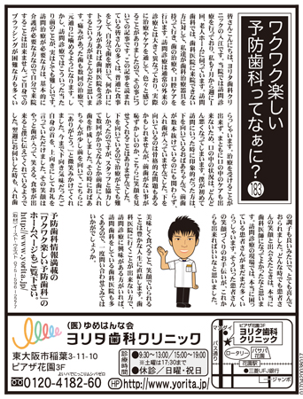 ワクワク楽しい予防歯科ってなあに vol.183 皆さんこんにちは、ヨリタ歯科クリニックの入江です。 当院では訪問診療を行っており、私も7月から週に1回老人ホームに伺っています。 訪問歯科では、歯科医院に来院できない方に対して、私達が歯科治療器具を持って行き、 訪問診療は通常の外来の診療とは大きく異なっており、実際に治療やケアを通して、 この記事を読まれている皆さんの多くは、普通に食事をして、自分で歯を磨いて、 痛みがあった歯も数回の治療で、元通りに噛めるようになります。 しかし、訪問診療ではこういった当たり前のことが、実はとても難しいです。 訪問治療が必要な方は、基本的に介護が必要な方なので、自分で来院することは出来ません。 ご自身でのブラッシングが困難な方も、多くいらっしゃいます。 治療を受けることが出来ず、まともに口の中のケアも出来ないため、 僕が初めて訪問にいった時に印象的だった方は、下を向いているおばあちゃんで、 下を向いているのは骨格的な問題もあるかもしれませんが、前歯がない事が恥ずかしいのか、 下を向いているので治療がとても難しかったのですが、スタッフと協力して その時におばあちゃんが少し前を向いて、こちらに「ありがとう。」と 今まで下向き気味だったご自身の首を、上向きにしてお礼を言っていただけました。 その笑顔はやっと歯が入って、笑える、食事が出来ると僕に伝えてくれているようでした。 どんな時でも患者さんの笑顔と出会えたときは、本当に歯科医師になってよかったなと思います。 訪問診療の現場では、本当に困っている患者さんがまだまだ多くいらっしゃいます。 美味しく食べること、笑顔でいられることは豊かな人生に直結します。 |