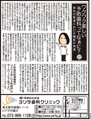 ワクワク楽しい予防歯科ってなあに? vol.203 こんにちは。 前々回の記事に、当院の管理栄養士坂口が乳児嚥下と離乳食の関係について 子育てのご経験があるお母さん達は、離乳食作りに苦労された方も 私にも5歳の息子がいますが、離乳食作りってかなり大変でした。 産後は、お母さん自体にも交通事故に遭ったくらいのダメージがあると言われていて、 『私が休みたいのに…なんでこんなに散らかされるんだろう…』 離乳食は【何を食べるか?】よりも【どうやって食べるか?】、 だから、「食べてくれない」ことは普通にあります。 産まれたばかりの赤ちゃんはおっぱいを飲みますが、 その【反射】がまだ残っている時期は、 例えば、スプーンなどをベーと押し返してしまう場合もそうですね。 【離乳食】は月齢になったから、大きくなったから、と言って自然に食べられる 身体の発達も首がすわり、寝返りができ、ずり這い、ハイハイ、つかまり立ち、 そして、身体の発達とお口の機能の発達は【連動】しています。 離乳食初期で学ぶことは、まず【唇を閉じる】こと。 それが出来るようになって、初めておっぱいやミルク以外のものを この時は入ってきたものを【そのまま飲み込む】つまり、【丸呑み】をしています。 そして、私達が食材豊かに色んなものを食べられるのは、 次回は、離乳食に関係する、【舌の働き】について、詳しくお伝えしますね。 |