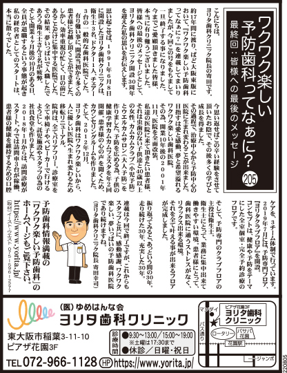ワクワク楽しい予防歯科ってなあに? vol.205 最終回 こんにちは。 約17年間に渡り、ぱど大阪東版において、『ワクワク楽しい予防歯科ってなあに?』を 思い起こせば、1991年6月8日に開設したヨリタ歯科クリニックは、 有難い事に、開設当初から多くの患者様にお越し頂くことができました。 その結果、夢いっぱいで入職したであろう衛生士さん3名が疲弊。 今思い返せばこの辛い経験をさせて頂いたお陰で、その後多くの学びと成長を得ました。 その為、開業10年後の2001年11月、医院を全面改装。 そして、2012年12月。 院内は、全てバリアフリー。 2018年1月からは、訪問診療がスタート。 2019年7月には、予防専門フロア、『ヨリタクラブフロア』を開設。 振り返ってみると、あっという間の30年。 連載は今回で終了ですが、これからもスタッフと共に (ヨリタ歯科クリニック院長 寄田幸司) |