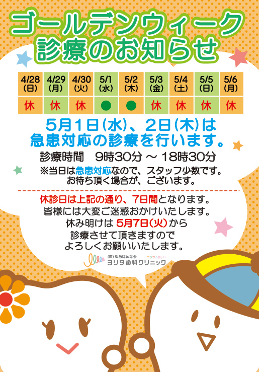 [’19/4/17] ゴールデンウィーク診療のお知らせ(変更有り)