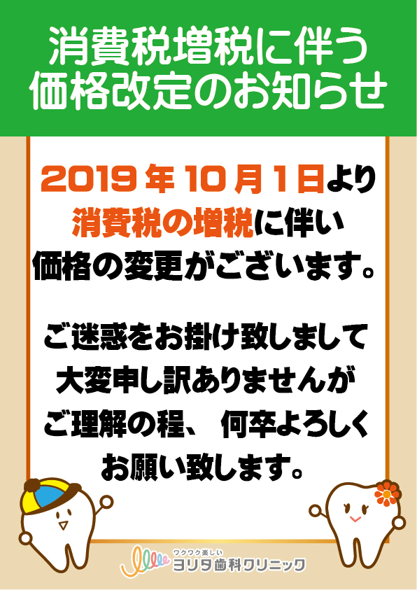 消費税増税に伴う価格改定のお知らせ access_time 2019.09.20 2019年10月1日より、消費税の増税に伴い 価格の変更がございます。 ご迷惑をお掛け致しまして、大変申し訳ございませんが ご理解の程、何卒よろしくお願い致します。 « 前へ一覧へ 次へ » 関連記事 お知らせ 2025.11.19 11/7~8の初回ご予約フォーム不具合についてのお詫び お知らせ 2025.11.10 【提携駐車場】パザパはなぞの駐車場 価格改定のお知らせ(2026年1月6日~) お知らせ 2025.11.08 12/23(火)カムカムEXPO2開催決定! ヨリタコラム お知らせ院長ブログDr.ブログ矯正ブログ管理栄養士ブログ赤ちゃん歯科ブログスタッフブログワクワク楽しいセミナー紹介ワクワク楽しい経営日記カムカムニュースメディア情報ヨリタ食堂ヨリタマニア 歯科豆知識 インプラントの豆知識一般歯科の豆知識予防歯科の豆知識審美歯科の豆知識小児歯科の豆知識歯周病の豆知識矯正の豆知識 新着記事 2025.12.15 口腔機能発達不全症・口腔機能低下症 2025.12.12 カムカムEXPO2オリジナルキーホルダー 2025.12.10 ワンタフトブラシ
