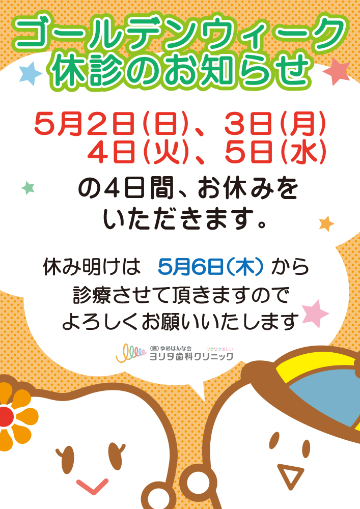 ヨリタ歯科クリニックから、ゴールデンウィークの休診のお知らせです。