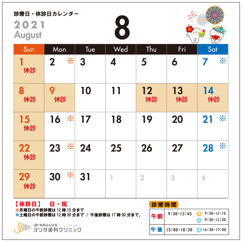 7月・8月の診療日、休診日のお知らせ