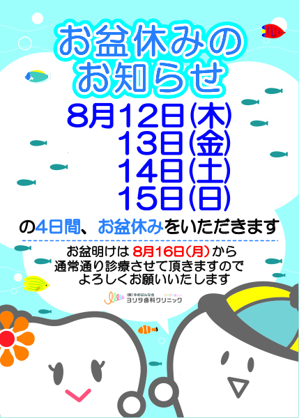お盆明けは、8月16日(月)から通常通り診療させて頂きますので
