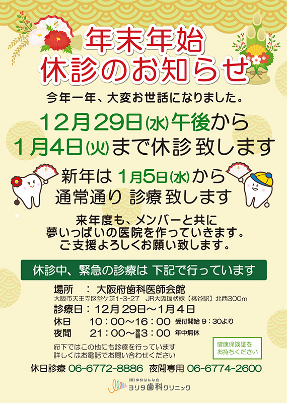 | 場所 :大阪府歯科医師会館 診療日:12月29日~1月4日 休日 10:00~16:00 休日診療 06-6772-8886 |