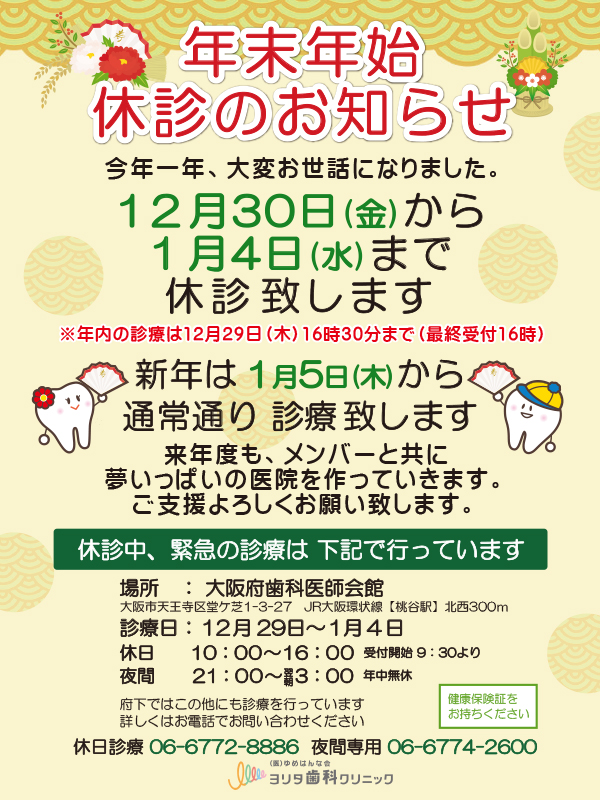 ヨリタ歯科クリニックより、年末年始の休診のお知らせです。