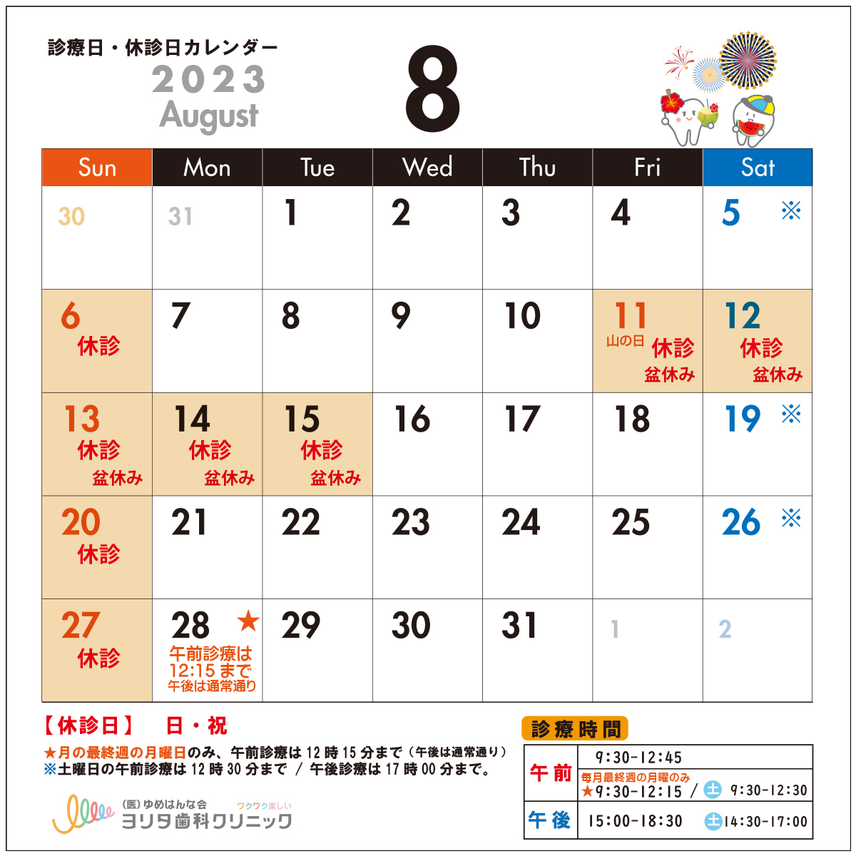 8月の休診日は、