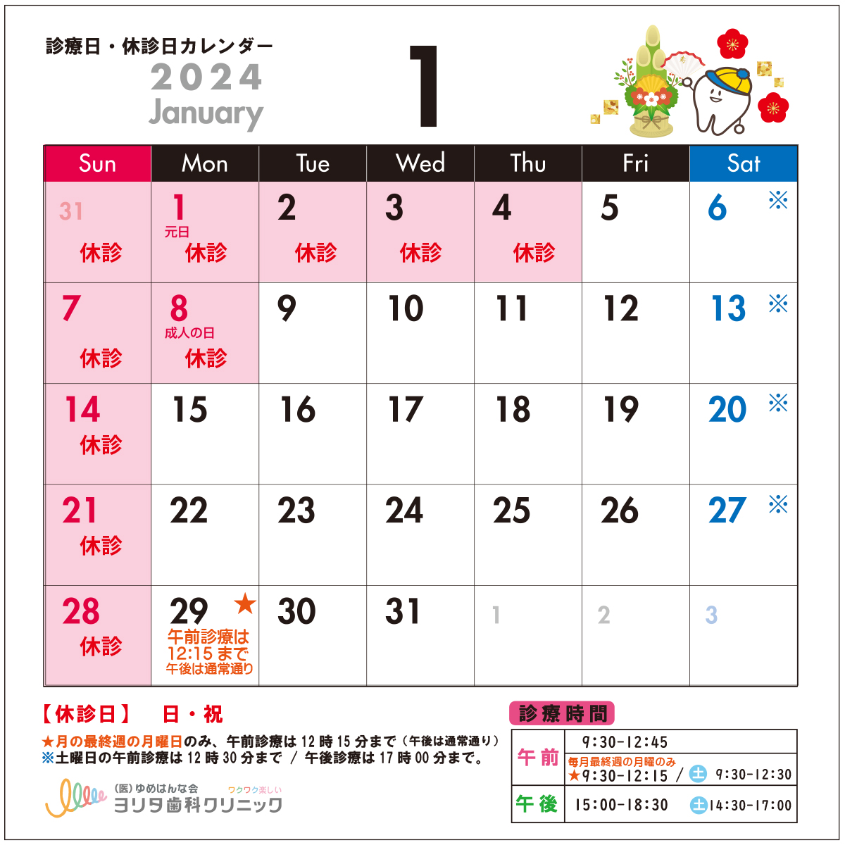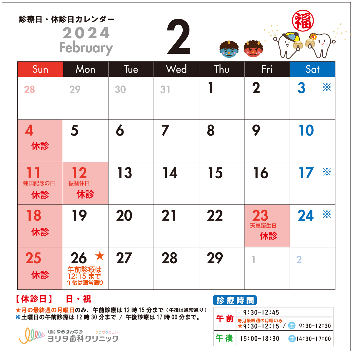 1月・2月の診療日、休診日、イベントのお知らせです。