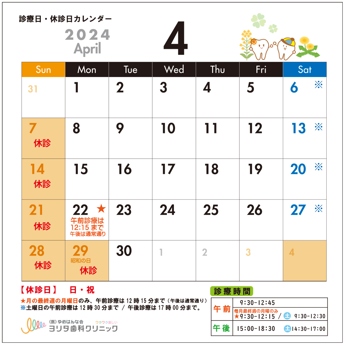 3月・4月の診療日、休診日、イベントのお知らせです。