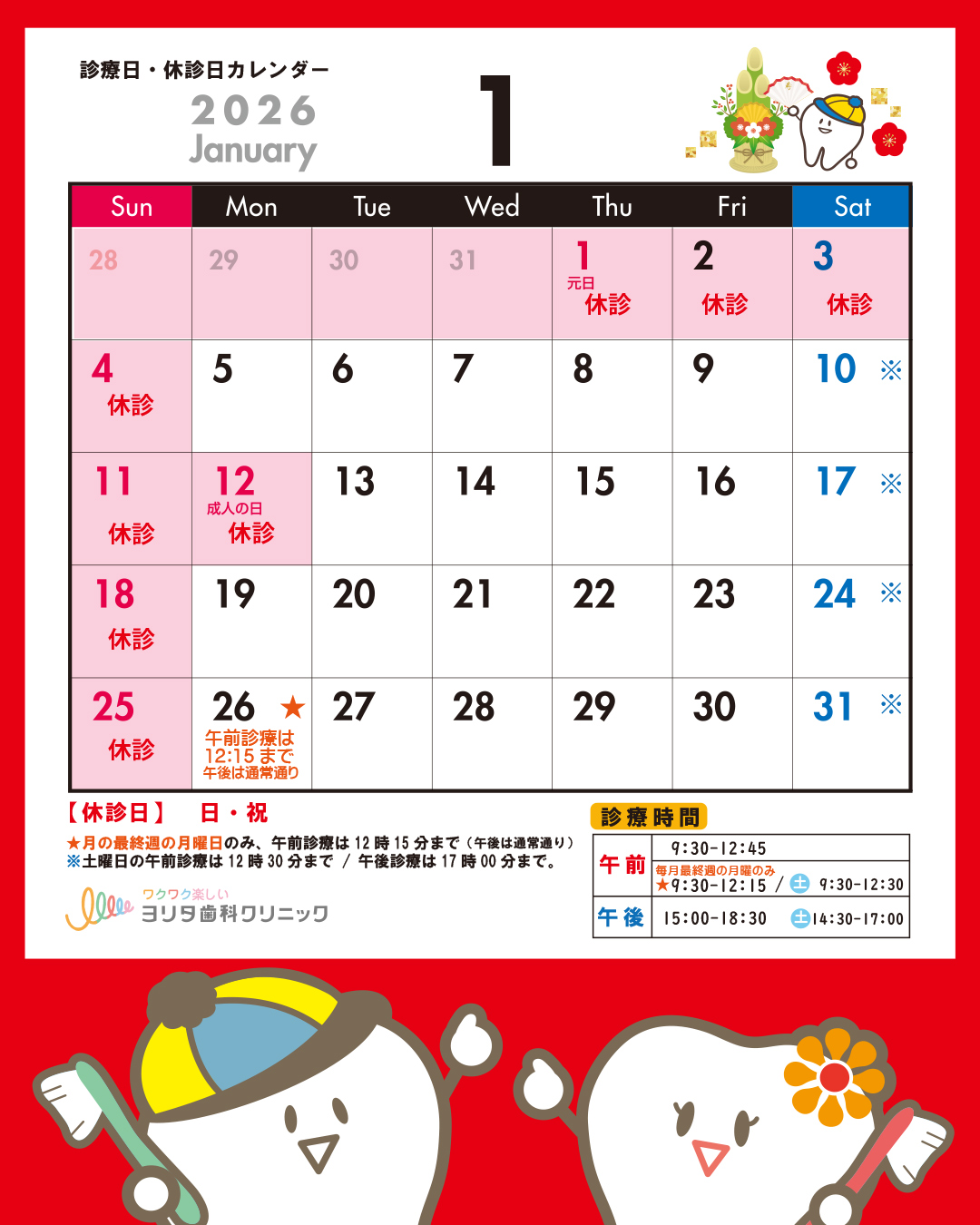 1月・2月の診療日、休診日、イベントのお知らせです。