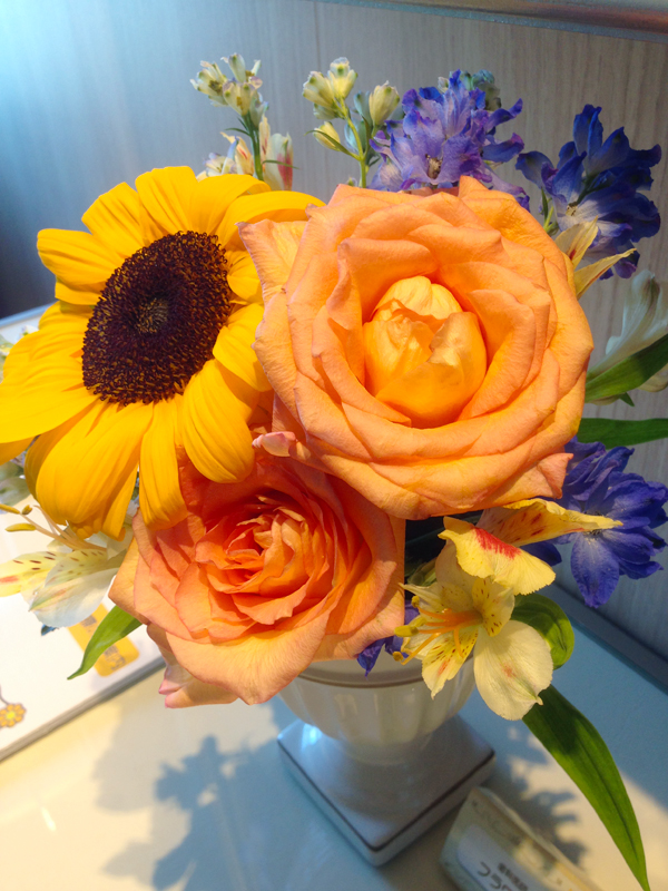 いきいきとしたヒマワリと、淡いサーモンピンクのバラの花をメインに