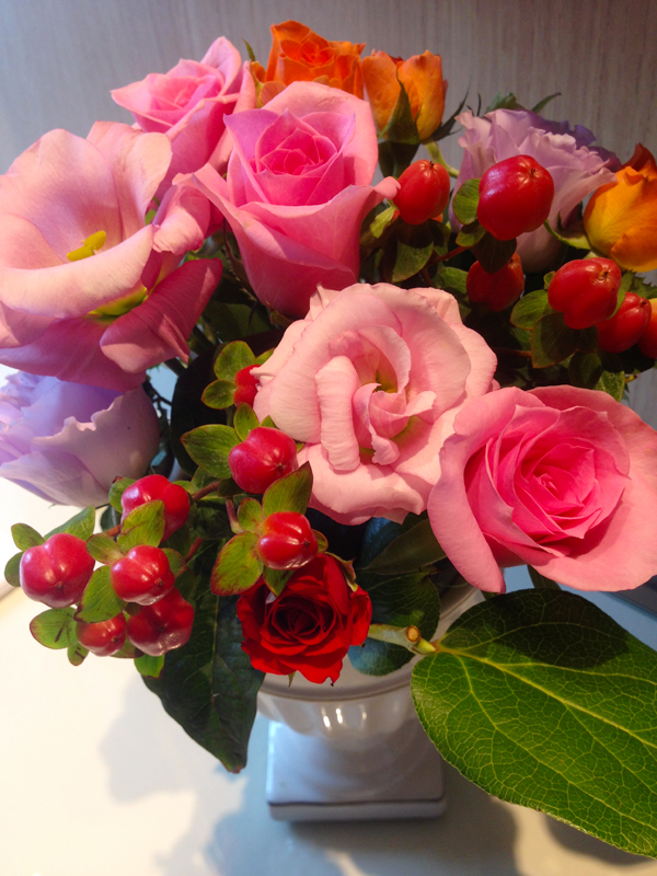 ピンクや赤、オレンジといった、暖色系のお花をふんだんに使った