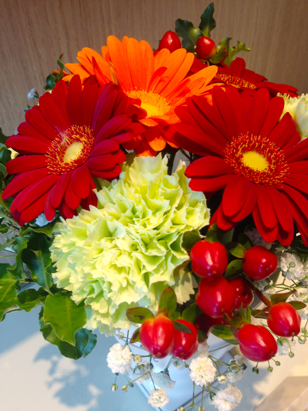 赤を中心とした鮮やかなガーベラと、やわらかな白のカーネーションや