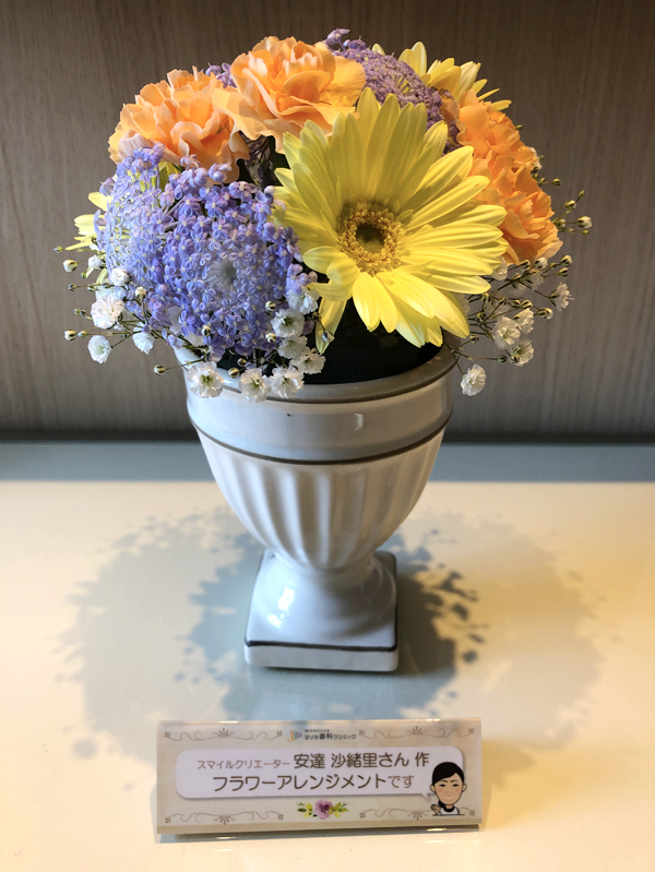このフラワーアレンジメントは当院のスマイルクリエーター(受付)や