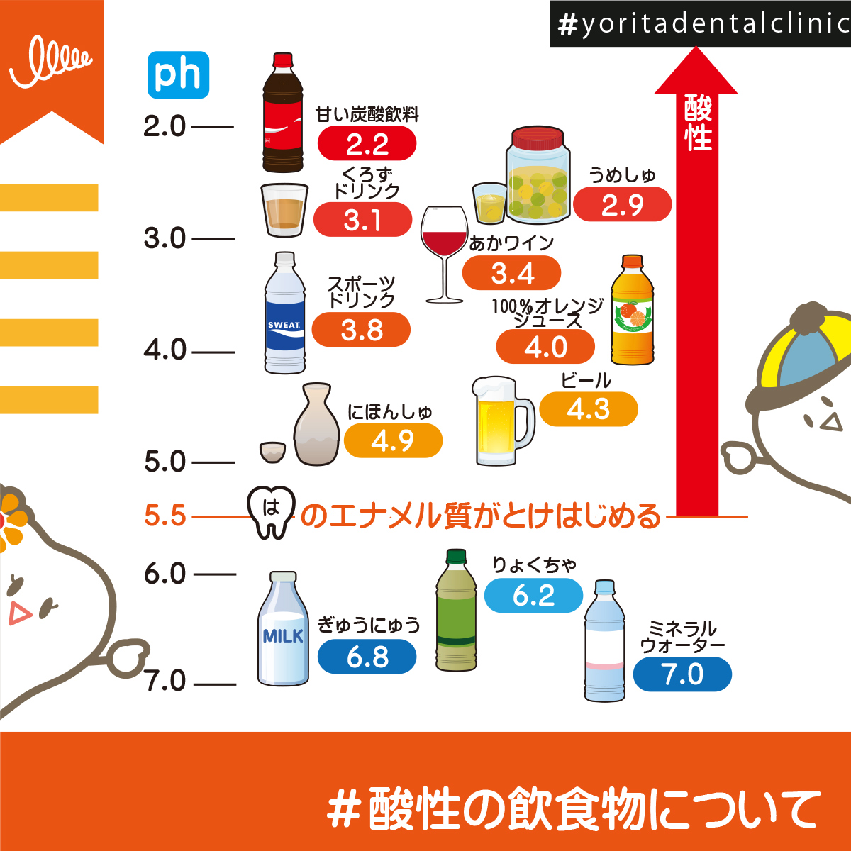 虫歯になる原因として、酸性の飲食物が関係しているとされています。