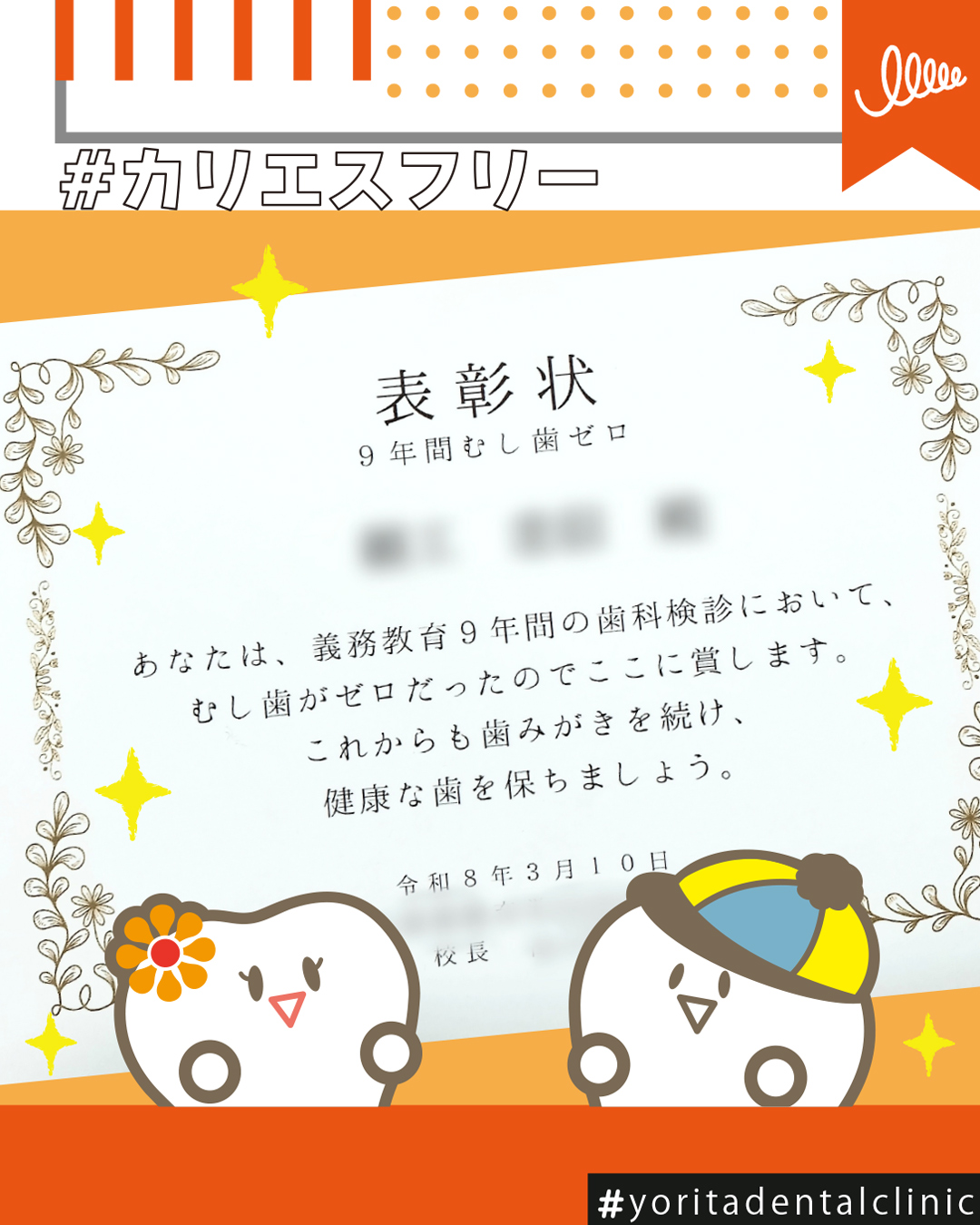 「9年間むしばゼロ」の表彰状をもらってきました👏👏