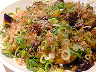 ゴマ油で香ばしく炒めたなすに、醤油、かつお節、刻みネギをのせたもの。