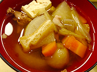 大根、人参、ごぼう、小芋、豆腐、油揚げ、豚肉と、具沢山!