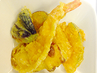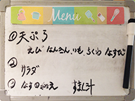 | ●天ぷら(海老、南瓜、さつまいも、ちくわ、茄子) ●サラダ ●茄子の和え物 ●すまし汁(玉子、えのき、ネギ) ●白ご飯 |