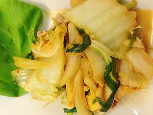 豚キムチ炒めは、シャキシャキのキムチ、ニラ、豚肉、玉ねぎとボリューム満点!