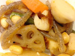 レンコン、小芋、大豆、こんにゃく、にんじん、さやいんげんと