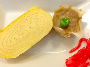 玉子焼きと焼売は、玉子焼きの優しい甘味と、焼売の豚肉の旨味が