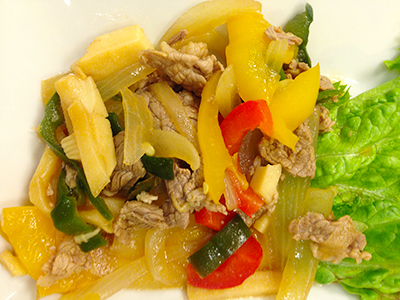ピーマンの緑とパプリカの黄と赤が見た目も鮮やかで、食欲もそそります!