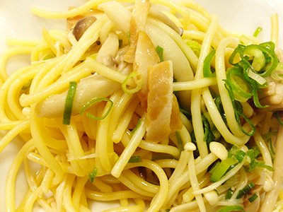 きのこ和風スパゲッティは、しめじ、えのきを中心に、きのこと葱がたっぷり!