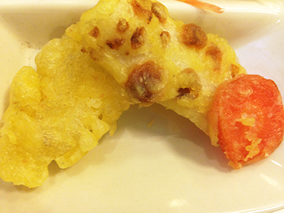 天ぷら盛り合わせ(人参、さつまいも、ちくわ)は、小ぶりに食べやすく
