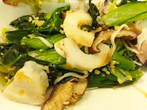 小松菜のおひたしは、小松菜と干ししいたけ、カニカマ、ちくわを