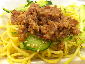 ジャージャー麺は、きゅうりの千切りと、甘辛い肉みそで麺をよく混ぜて食べる