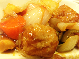 肉団子の酢豚は、むっちりと詰まった肉団子と、ピーマン、人参