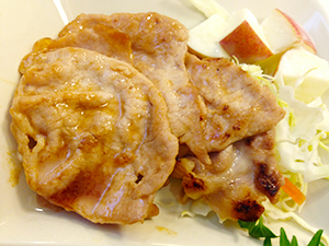 分厚めの豚のロース肉に、濃いめに味付けされた豚の生姜焼きは