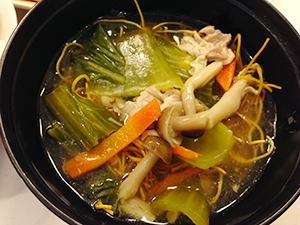 パリパリの細めの揚げ麺のうえに、野菜など具沢山のアツアツのあんを