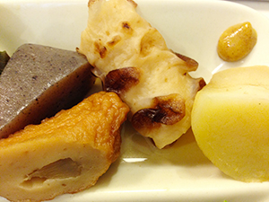 ミニおでんは、こんにゃく、ごぼう天、ちくわ、じゃがいもの