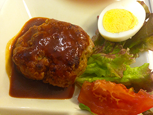 じっくり焼き上げたハンバーグに、ソースをたっぷりかけて