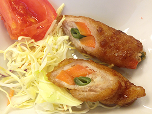 豚肉の野菜巻きは、いんげん、人参を豚肉で巻き、照り焼きにした