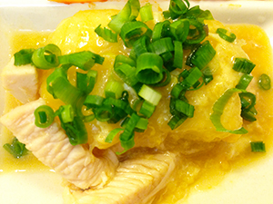 あんかけ豆腐は、揚げ出し豆腐の上に、鶏肉と玉子あん、たっぷりのネギを