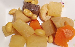 五目煮は、ちくわ、こんにゃく、人参、レンコン、大根の